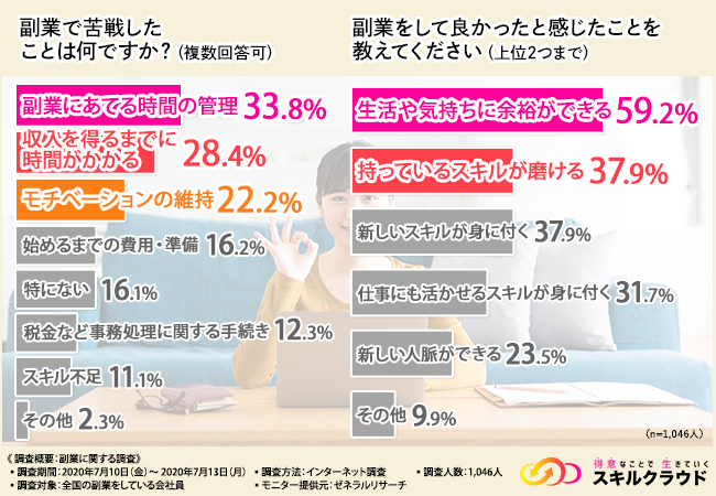 一方、良かったことは「生活や気持ちに余裕ができる(59.2%)」が最多、同率で「持っているスキルが磨ける(37.9%)」「新しいスキルが身に付く(37.9%)」だった。