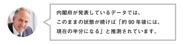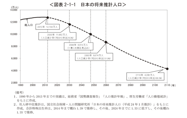 現在の人口増加・減少率のままでは、2050年には総人口9,000万人前後、2105年には4,500万人まで減少するといわれています。