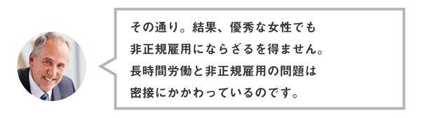 次の項でお話しする非正規と正社員の格差も「非正規への選択肢を選びにくくする」という点で、長時間労働・正社員の負担増加にかかわっているわけです。