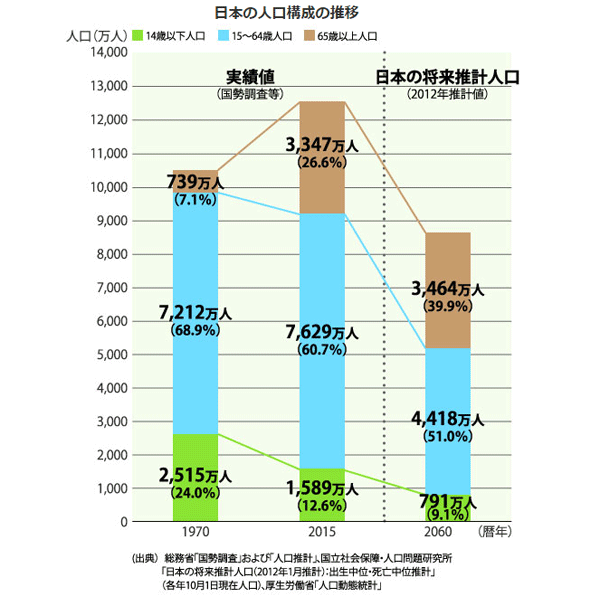 労働力人口(生産年齢人口)は2060年にはピーク時の半分に