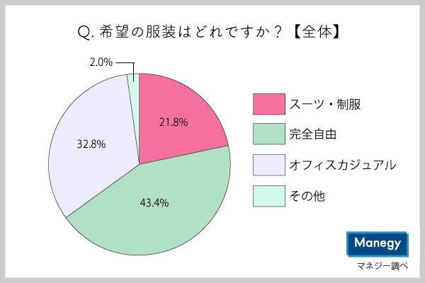 「スーツ、制服」の会社は全体の3分の1程度。自分が着たい服を選べやすい「オフィスカジュアル」と「完全自由」の会社が多く、働く人の裁量に任されているのがわかった。
