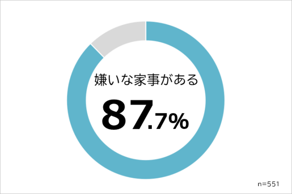 最初の質問は「嫌いな家事はあるか?」。結果は87.7%が「ある」で、ワーキングマザーの大半は、何かしら嫌いな家事があることがわかった。