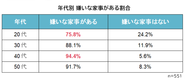 20代~50代の年代別に見ると、若年層よりも中年層の方が「嫌いな家事がある」と回答している割合が多く、最多の40代と最少の20代では18%以上の差があった。一般的に年齢が上がるにつれて体力が衰えてくるため、40代~50代は家事に後ろ向きなのかもしれない。