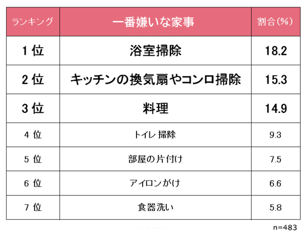 次に、嫌いな家事があると答えた483人に、最も嫌いな家事を1つだけ挙げてもらった。その結果、見事(?)1位になったのは「浴室掃除(18.2%)」、2位は「キッチンの換気扇やコンロ掃除(15.3%)」、3位は「料理(14.9%)」だった。