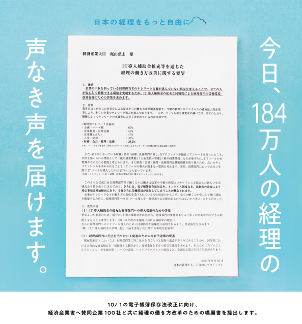9月30日(水)、経理の新しい働き方を共創するプロジェクト「日本の経理をもっと自由に」が経済産業省へIT導入補助金拡充等を通じた経理の働き方改善に関する嘆願書提出、および、新たなアクションの発表に向け記者会見を開いた。