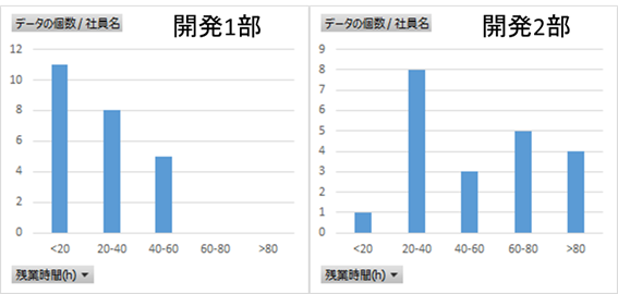 ヒストグラムで表示することで、部門ごとに残業時間のばらつきを可視化し、一部の社員に負荷が偏っている部門を見つけることができます。