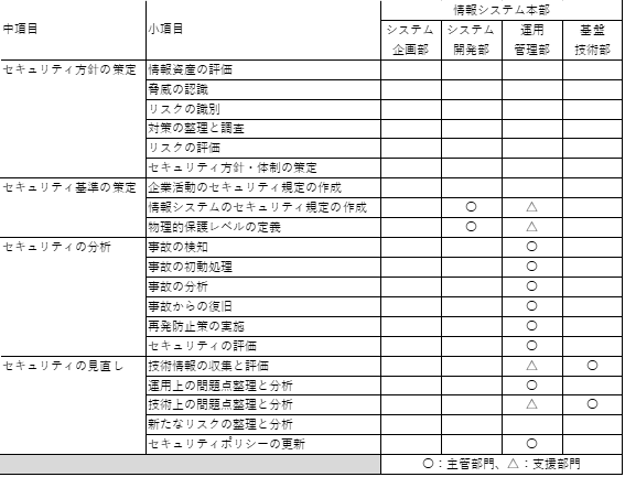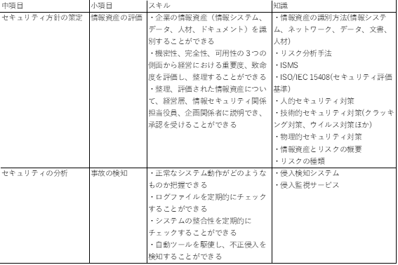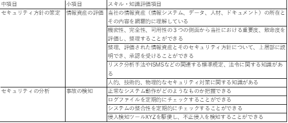 代表例として、中項目「セキュリティ方針の策定」の小項目「情報資産の評価」と、中項目「セキュリティの分析」の小項目「事故の検知」の部分を抜粋したものが次の表になります。