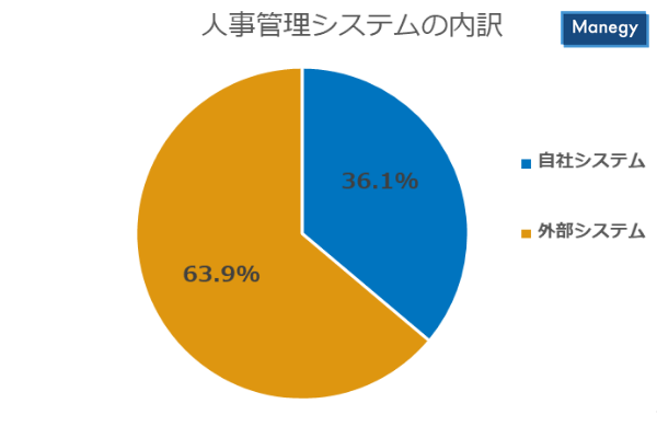 人事管理システムは、自社独自システムと外部システム(製品)の2つに大きく分けられる。それらの利用割合を表したのがこちらの円グラフ。