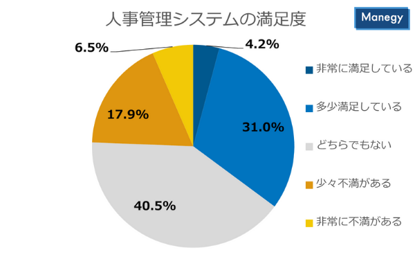 “非常に”と“多少”を合わせた満足派の人は計35.2%。同様に、不満派の人は計24.4%で、利用者の多くはある程度、使っている人事管理システムを肯定的にとらえているようだ。