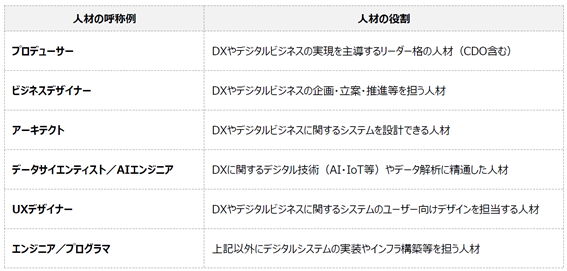 独立行政法人情報処理推進機(以下IPA)が、2019年5月17日に公開した「デジタル・トランスフォーメーション推進人材の機能と役割のあり方に関する調査」(以下、IPA調査)では、DX 推進を担う人材の状況について調査を行っていますが、その際に、DX推進人材の種類として6つの職種を定義しています。