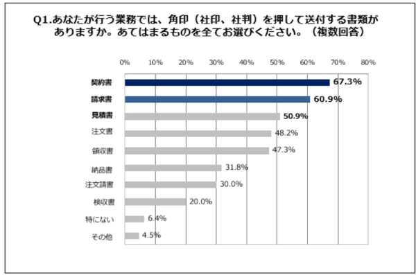 結果は、最多が「契約書」で67.3%、以下「請求書」60.9%、「見積書」50.9%で、それ以外は上記グラフのとおりとなった。