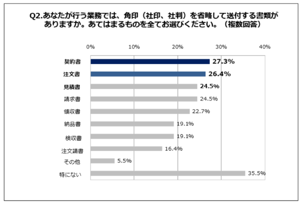 結果は、Q1で“角印が必要な書類”トップだった「契約書」が、こちらでも最多で27.3%だった。それ以外は「注文書」26.4%、「見積書」24.5%と続いた。