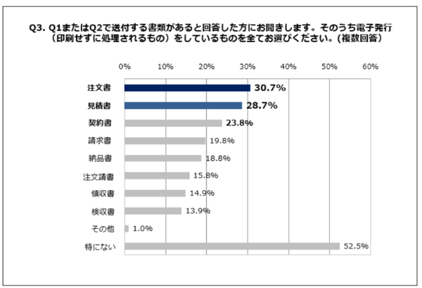 最も多かった回答が「特にない」で52.5%。半数以上の企業はまだ、書類の電子発行に対応していないことがわかった。以下、「注文書」30.7%、「見積書」28.7%、「契約書」23.8%の順番で多かった。