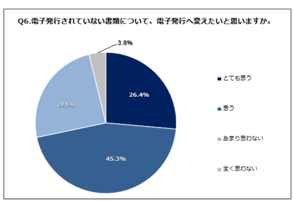 結果は、「とても思う」が26.4%、「思う」が45.3%で、計70%以上の人が電子発行を希望していることが判明。作業の効率化やコスト削減、さまざまなソフトとの連携など、メリットが多い電子発行を多くの人が支持していることが判明した。