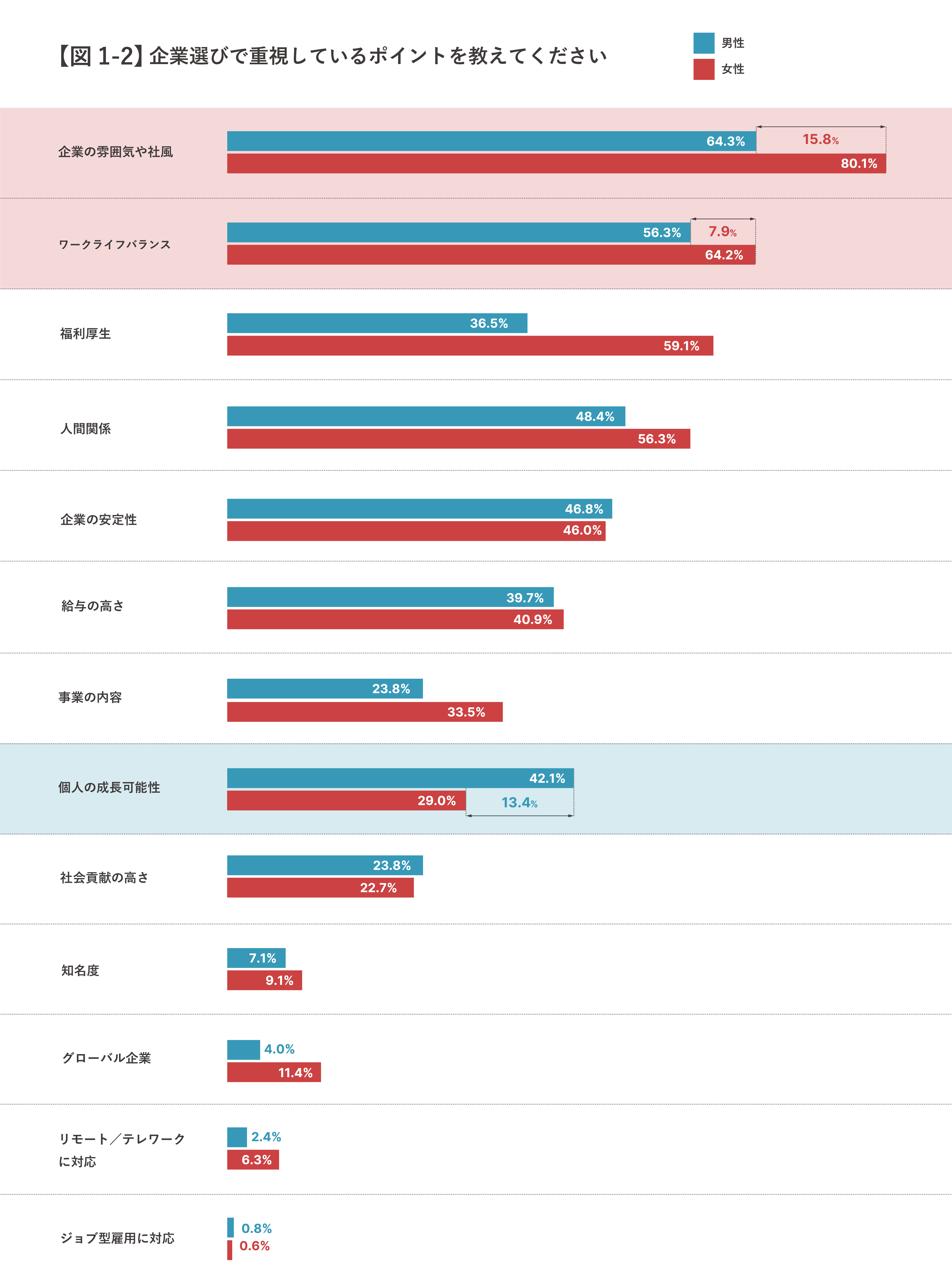 また、男女別で見ると、男性が際立って多く回答したのは「個人の成長可能性」(42.1%)。一方、女性はワークライフバランスや企業の雰囲気・社風を重視する傾向があった。