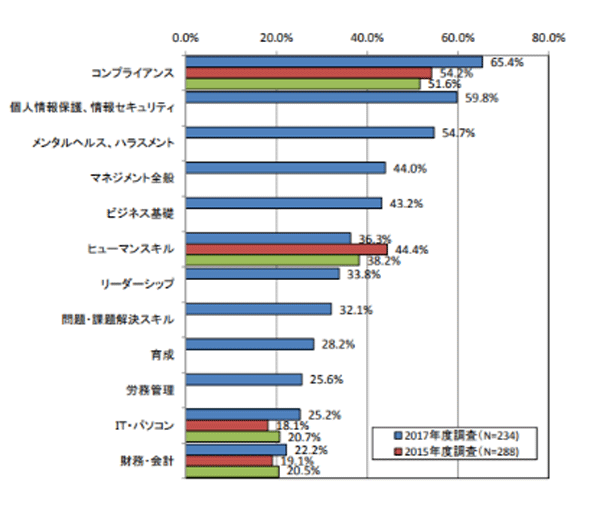2位、3位の「個人情報保護、情報セキュリティ」(59.8%)、「メンタルヘルス、ハラスメント」(54.7%)を見ても、半数以上の企業で実施されており、近年、コンプライアンス、ハラスメントに関連したニュースが報道される機会も非常に多いことが影響をしているのか、経年で見ると、社会状況を反映したテーマが 選ばれる傾向はより強くなっているといえるのではないでしょうか。