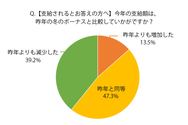 問3は、同じく問1で「支給される」と答えた人を対象に「今年の支給額は、昨年の冬のボーナスと比較していかがですか?」と質問した。結果は以下のとおりだ。