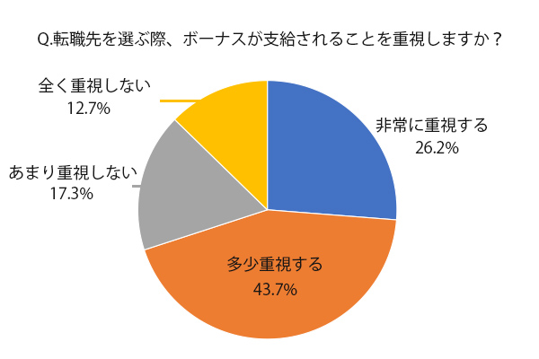 結果は、「非常に重視する」と「多少重視する」で合わせて69.9%と、約7割の人がボーナスの有無を転職時に気にしていることがわかった。