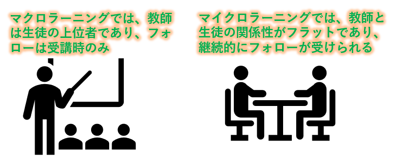 マクロラーニングでは、原則として教師は生徒の上位者であり、コミュニケーションは、ほぼ一方的で、フォローのタイミングも研修実施時に限定されます。