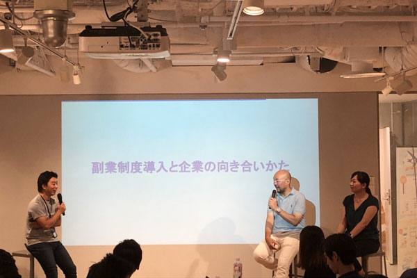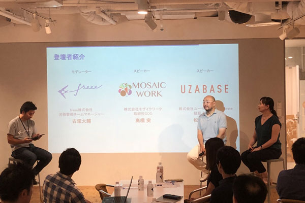 副業OKのユーザベースさん、freeeさんには従業員の副業に関するリアルな部分について、また、モザイクワークほか数社でご自身がリアル複業中の高橋さんには複業する側の様子について、それぞれお話いただきました。