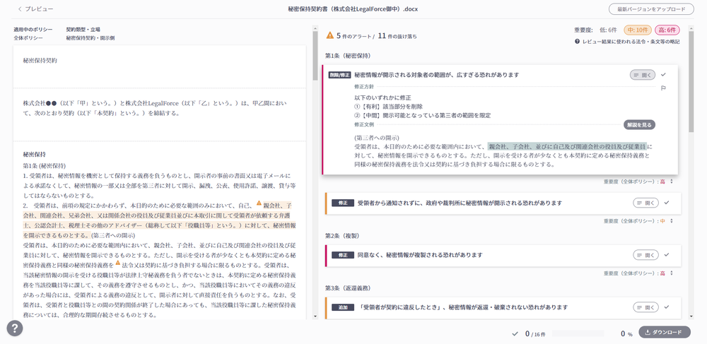 AIによる契約審査機能では、例えば、反社条項の欠落の発見や、下請法違反の恐れのある条項の発見なども瞬時に行うことができるので、上場準備企業の契約審査体制をより盤石なものとすることができます。