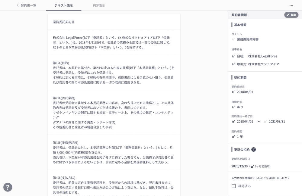 Marshallでは、締結した契約書のPDFデータをアップロードするだけで、当事者名、契約期間、自動更新の有無といった情報を自動で抽出して管理項目として台帳入力を行います。契約期間の終了時期や更新期限を一元管理することができるため、「契約が切れたまま取引を継続してしまった」といった事態を防ぐことが可能です。
