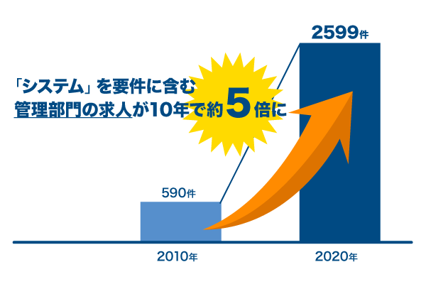 今から約10年前の2010年に当社へ寄せられた求人のうち、「システム導入」に関する記述がある求人数は62件しかありませんでした。対して2020年では288件と、およそ4倍にまで膨れ上がっています。また、「導入」までを記載してなくても「システム」に関する記述がある求人は、2010年の590件に対して2020年には2599件と約5倍にまで膨れ上がっており、システム関連の業務が管理部門全体で増えてきていることがはっきりとわかります。