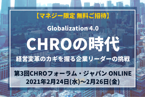| イベント名 | 第3回CHROフォーラム・ジャパン ONLINE ~Globalization 4.0 CHROの時代 経営変革のカギを握る企業リーダーの挑戦~ |