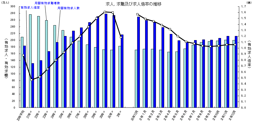 ※グラフは厚生労働省 公式サイト「一般職業紹介状況(令和2年12月分及び令和2年分)について」より転載