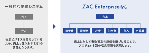ZAC Enterpriseはシステム開発・広告・Webなどクリエイティブ業に特化したクラウドERPです。中堅・中小企業に特化したERPとして、500社以上の導入実績があります。業務の一元管理による効率化に加え、案件・プロジェクトの利益をタイムリーに見える化し、利益体質な組織を実現します。