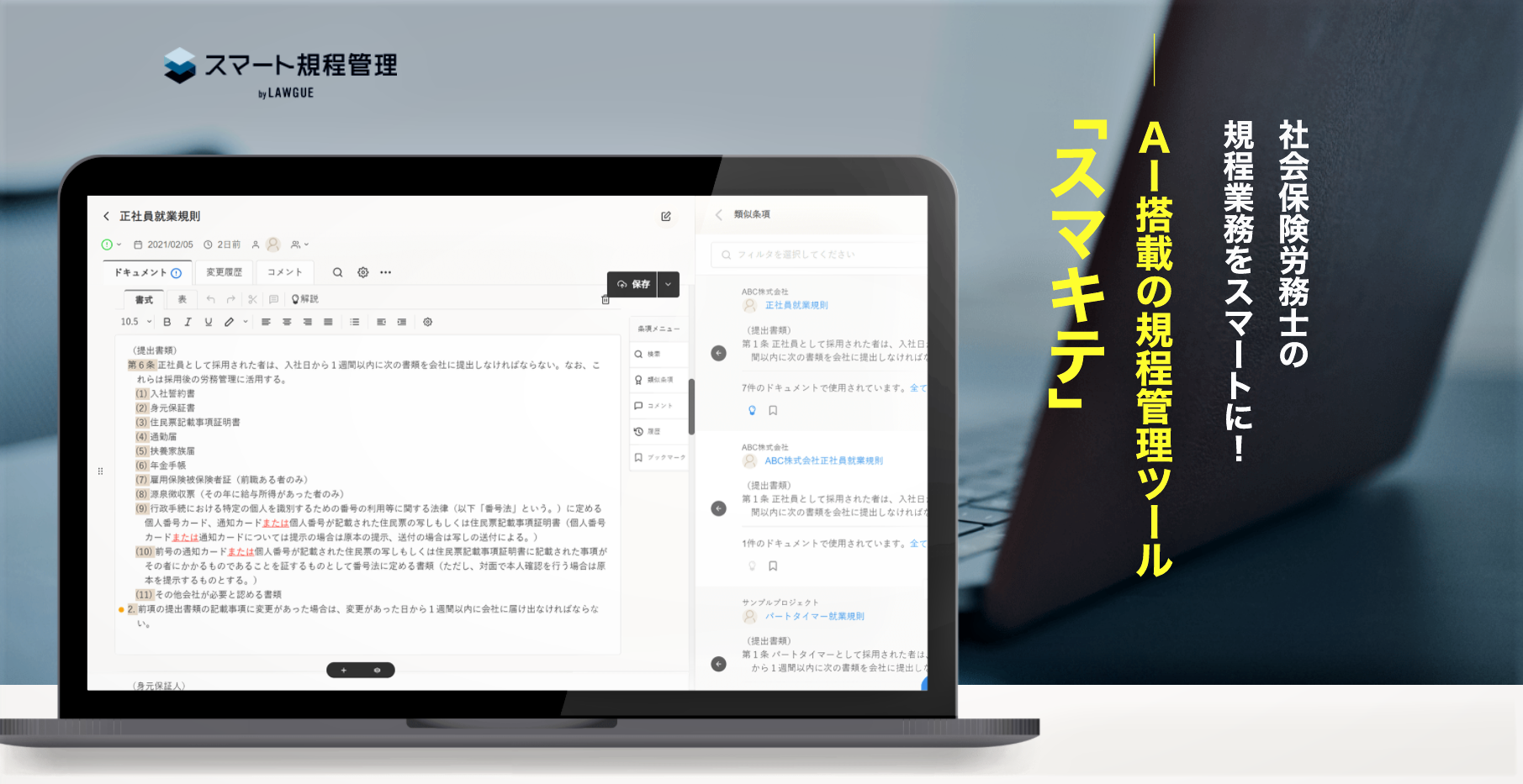 本製品、通称「スマキテ」は、同社が資本・業務提携を行う株式会社日本法務システム研究所(以下「日本法務システム研究所」)と共同開発した新サービス。社会保険労務士が行う規程関連の業務(作成・管理・編集作業など)をクラウドで一元化し、規程管理業務のスマート化を実現する。
