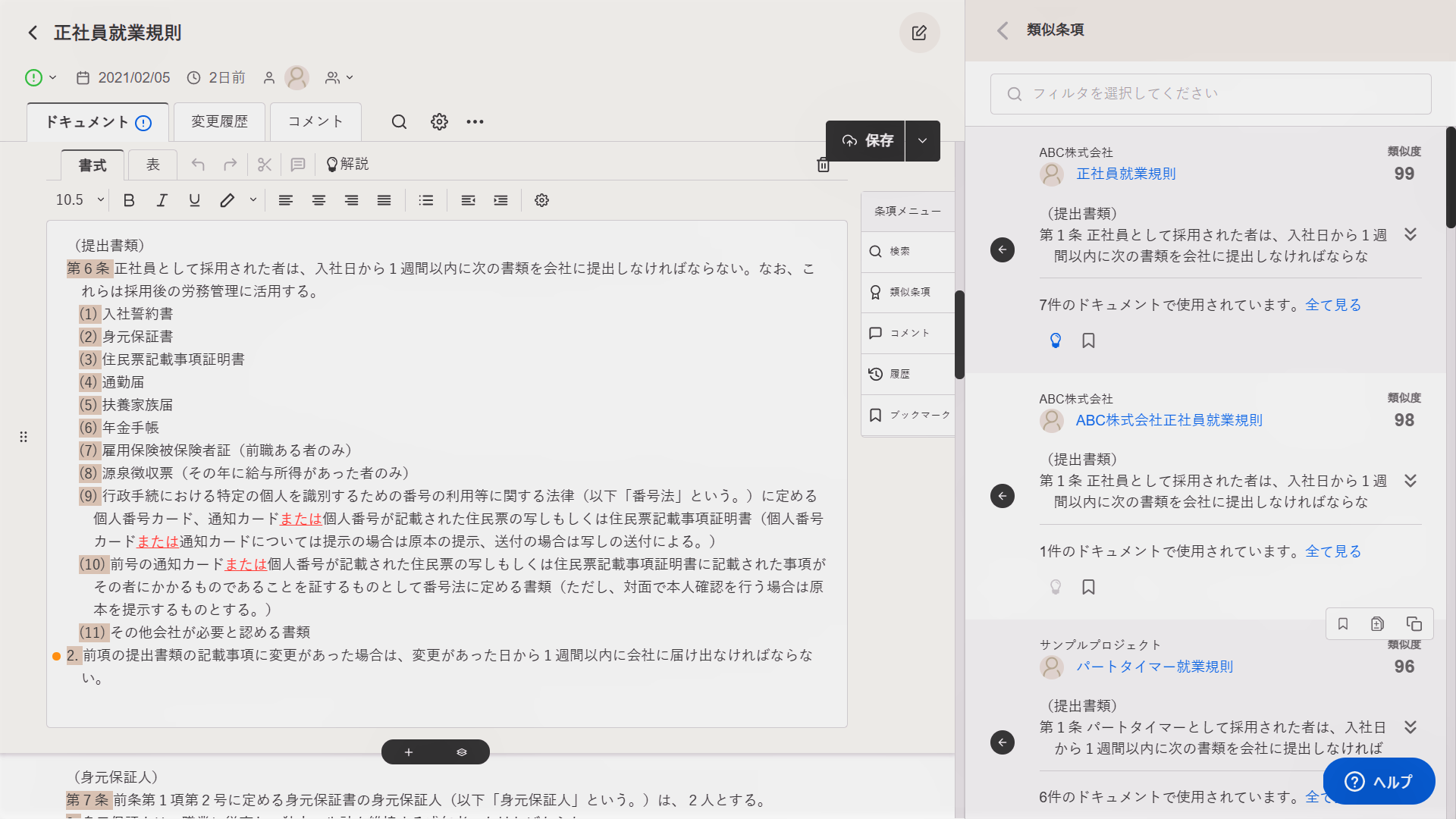 ・コメントや編集履歴が蓄積され、該当条項を再利用する際に参照できる