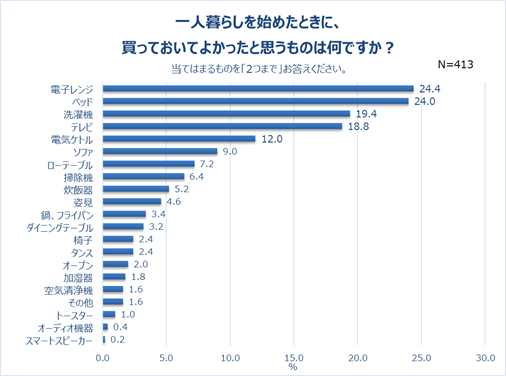 ちなみに、家具・家電・生活雑貨について、買っておいてよかったものを尋ねた質問では、1位「電子レンジ」(24.4%)、2位「ベッド」(24.0%)、3位「洗濯機」(19.4%)という結果に。「特にない」と答えた人は17.4%だった。さまざまなシーンで使える便利な電子レンジは、一人暮らしの強い味方と言えそうだ。