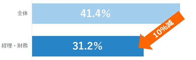 多くの企業の経理・財務部門ではまだ紙の書類の処理が必要で、出社が必要な仕事が複数あるのが現状のようだ。今回の調査結果でもその傾向が表れており、テレワーク率は全体平均値41.4%に対して経理・財務部門が31.2%と、約10ポイントも少なかった。