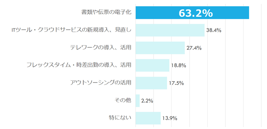 最多回答が「書類や伝票の電子化」で63.2%に。手入力による処理がいまだ多く、テレワークを導入しても出社せざるを得ない現状が見える結果となった。