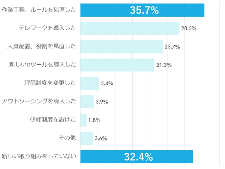 最も多かった回答は「作業工程、ルールの見直し」で35.7%に。「テレワークの導入」は28.5%、「新しいITツールの導入」は21.3%だった。