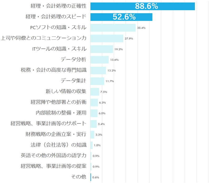 その結果は、最多が「経理・会計処理の正確性」88.6%、以下「経理・会計処理のスピード」52.6%、「PCソフトの知識・スキル」38.4%と続いた。経理・財務に関する基本業務の強化こそ、求められているスキルであることが判明した。