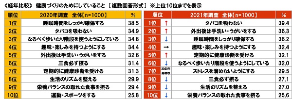 昨年(2020年)の調査結果と比較すると、順位が上がったのは「タバコを吸わない」(2020年2位→2021年1位 ※年の順番は以下同)、「外出後は手洗い・うがいをする」(5位→2位)など。