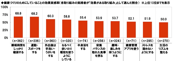 各取り組みの効果実感率(各取り組みの実践者が、効果がある取り組みとして選んだ割合)をみると、1位は「睡眠時間をしっかり確保する」(68.8%)だった。以下、2位「運動・スポーツをする」(68.2%)、3位「外出後は手洗い・うがいをする」(60.3%)、4位「なるべく歩いたり階段を使うようにしている」(58.8%)など。
