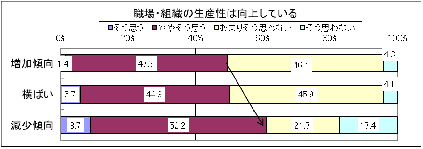 「職場・組織の生産性は向上している」と「心の病」の増減傾向をクロスしたものですが、心の病が「減少傾向」と回答した企業では、「生産性が向上している」に肯定的な回答が60.9%と、「横ばい(50.0%)」「増加傾向(49.2%)」と比較して割合が高くなっています。