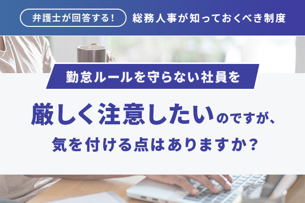当社では、法令遵守や長時間労働の防止のため、勤怠管理システムを通じて労働時間を正確に申告するよう、社内で繰り返しアナウンスしています。時間外勤務の申告があれば、それに沿って三六協定の手続きや残業代支払いを行っています。 多くの人はこのルールに従っていますが、「面倒くさい」「時間が長くなると色々言われるのが嫌だ」などの理由から、きちんと申告しないまま残業する社員が一部見受けられます。会社ルールに反するとして注意してもよいですか?