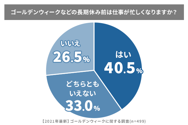 「ゴールデンウィークなどの長期休み前は仕事が忙しくなりますか?」との質問には、「はい」が40.5%、「いいえ」が26.5%、「どちらともいえない」が33%。やはり、忙しい人の方が多いという結果でした。ゴールデンウイークは月末月初にあたるため、バックオフィス従事者たちは締め作業などの前倒しで、より多忙なのかもしれません。“連休前は忙しく、連休中はのんびり”が、今年のゴールデンウイークの特徴と言えます。