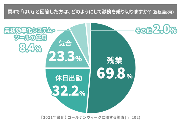 では、皆さんは忙しさをどう乗り切っているのでしょうか? 「前問で“はい”と回答した方は、どのようにして激務を乗り切りますか?(複数選択可、n数=202)」と尋ねてみました。最も多かった回答は「残業」69.8%。次に「休日出勤」32.2%、「気合」23.3%、「業務効率化システム・ツールの使用」8.4%、「その他」2%と並びました。