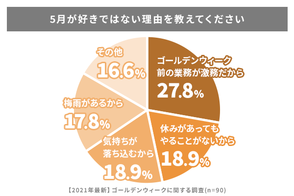 一方、5月が好きでない人々(n数=90)に、その理由を尋ねてみました。結果は「ゴールデンウィーク前の業務が激務だから」27.8%、「休みがあってもやることがないから」18.9%、「気持ちが落ち込むから」18.9%、「梅雨があるから」17.8%、「その他」16.6%でした。