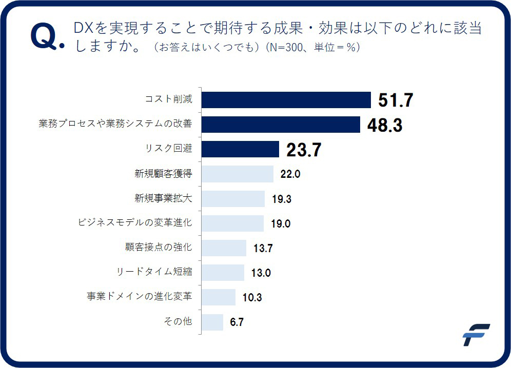 次に、DXに期待する成果や効果にはどんなものがあるかについて尋ねた(複数回答可)。最多回答は「コスト削減」で51.7%、次いで48.3%を占めた「業務プロセスや業務システムの改善」が多かった。この2つは一般的に最もわかりやすい成果・効果と言えそうだ。また、「リスク回避」(23.7%)をあげる人も比較的多かった。