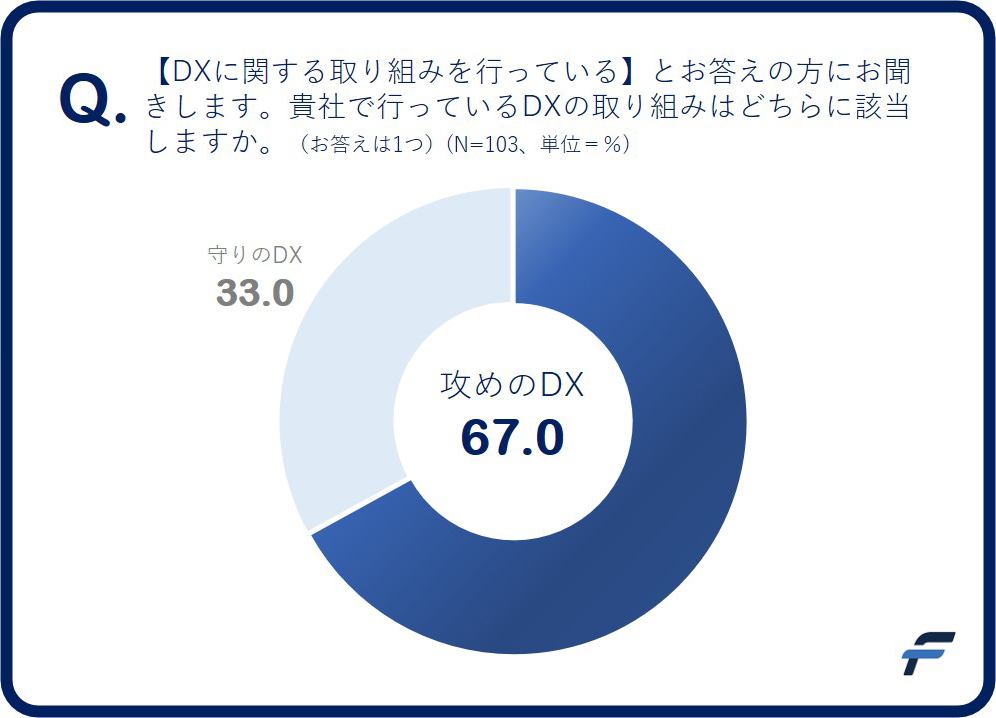 では、企業はどちらのDXへの取り組みを強化しているだろうか? 本アンケートで聞いた結果は、DXに関する取り組みを行っていると回答した企業の67.0%が「自社で行うDXは“攻めのDX”に当てはまる」と回答した。