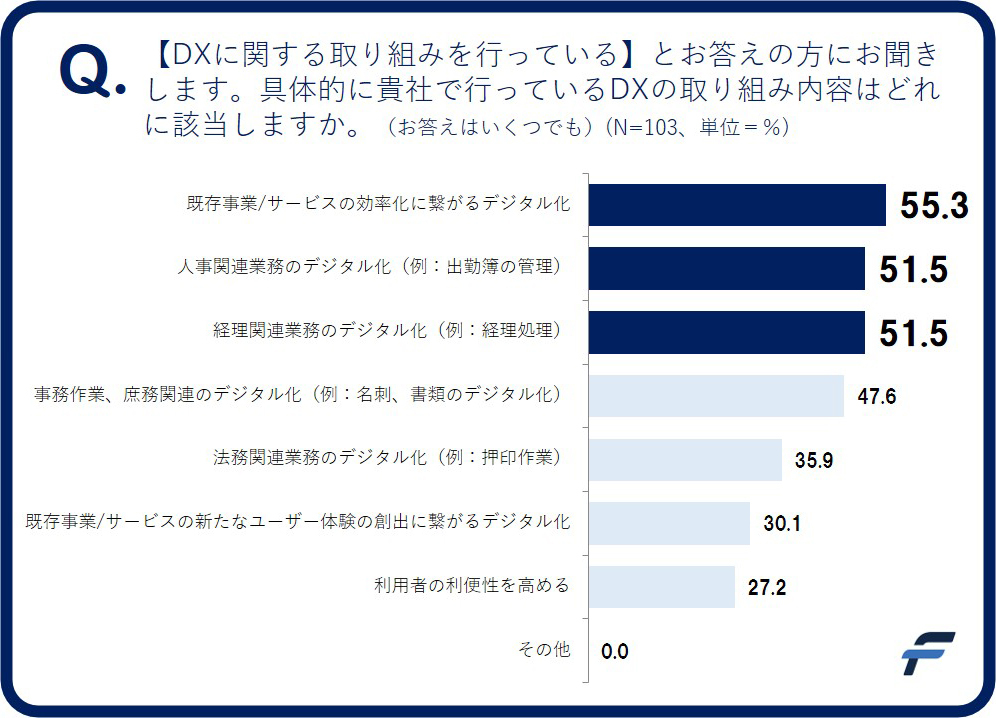 一方で、具体的に行っているDXの取り組みを聞いたところ、「既存事業/サービスの効率化に繋がるデジタル化」(55.3%)や「人事関連業務のデジタル化(例:出勤簿の管理)」(51.5%)など、“守りのDX”に該当する取り組みを行っている企業が多かった。「自社で取り組んでいるDXは“攻めのDX”に該当する」と回答した企業の56.5%が、実際は“守りのDX”を行っていることが判明した。