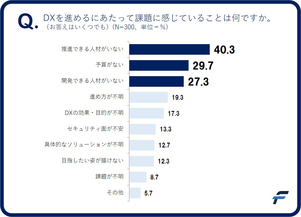 では、DXを進めるにあたって企業が感じている課題は何だろうか。DXの必要性を感じつつも、実施に踏みきれない企業を対象に聞いてみた。結果は「推進できる人材がいない」が40.3%を占め、「開発できる人材がいない」も27.3%と、“DX人材の不足”が大きな障壁となっていることが判明した。これは、人事担当者が積極的に取り組むべき課題と言えるだろう。