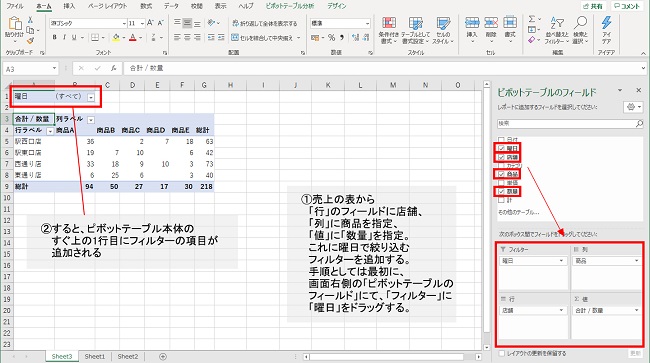 売上の表から、「行」のフィールドに店舗、「列」に商品を指定し、「値」に「数量」を指定し、店舗/商品別に数量を集計するピボットテーブルを作成したとする。これに曜日で絞り込むフィルターを追加し、曜日ごとの集計も見られるようにしてみよう。