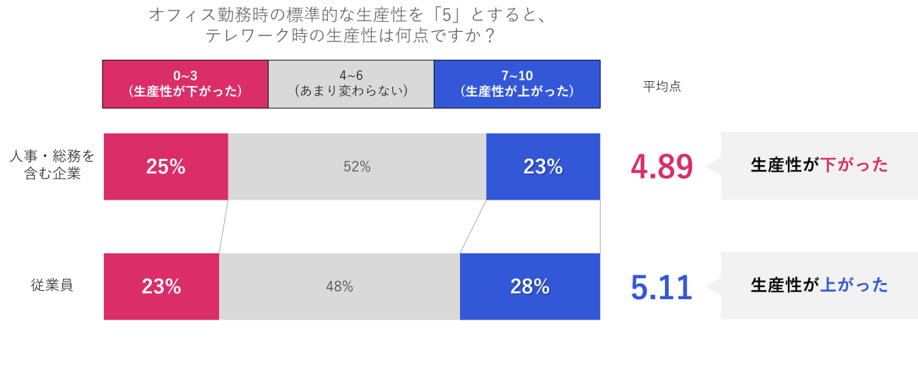 アンケートではまず、テレワーク時の生産性について尋ねた。結果、従業員側は「オフィスより生産性が上がった」と回答する人が多い一方、人事・総務担当者を含む企業側は「生産性が下がった」と回答する人が多かった。どうやら、従業員と企業には認識ギャップがあるようだ(グラフ内の数字1~10は、オフィス勤務時の標準的な生産性を「5」点としたときの点数。以下同)。